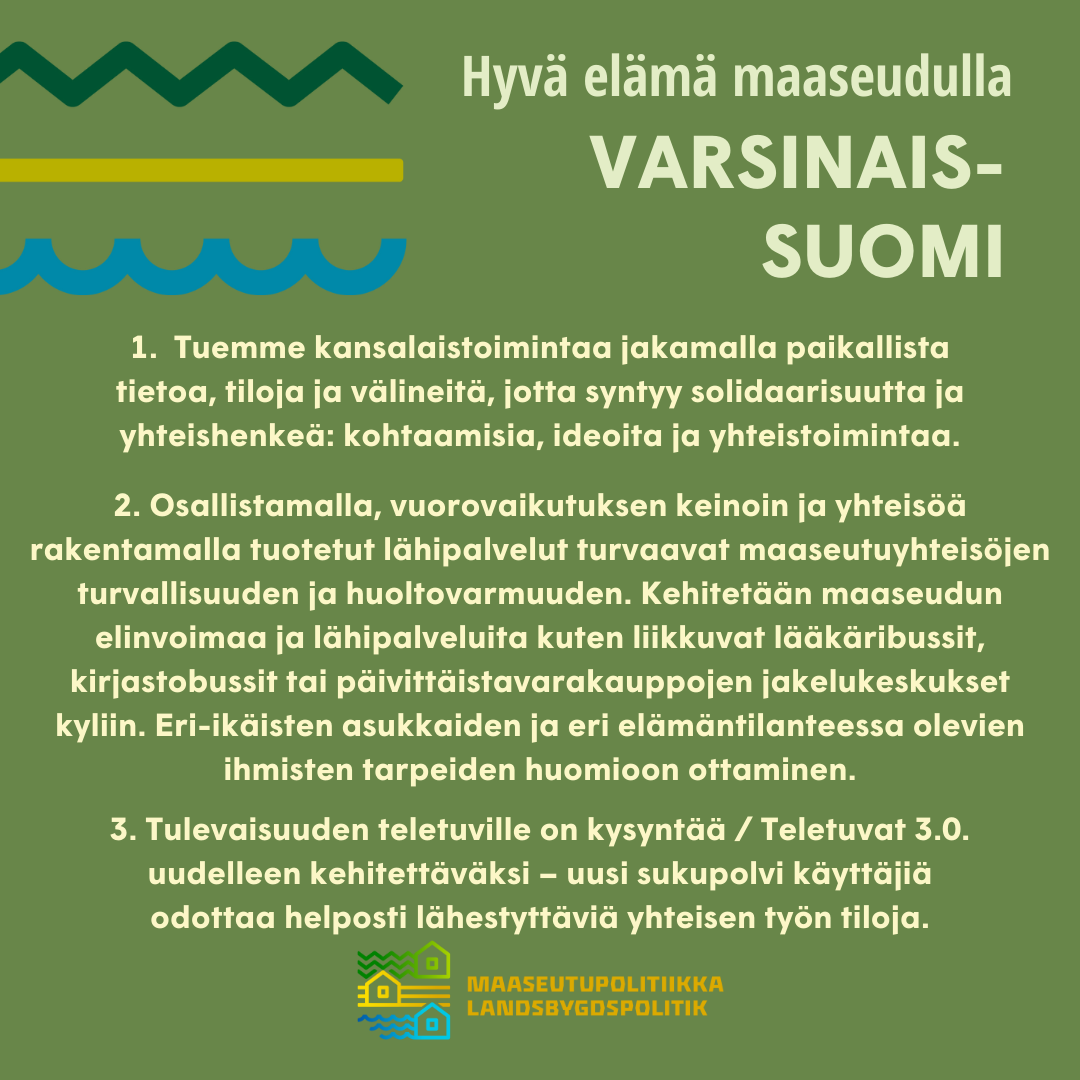 "Osallistamalla, vuorovaikutuksen keinoin ja yhteisöä rakentamalla tuotetut lähipalvelut turvaavat maaseutuyhteisöjen turvallisuuden ja huoltovarmuuden. Kehitetään maaseudun elinvoimaa ja lähipalveluita kuten liikkuvat lääkäribussit, kirjastobussit tai päivittäistavarakauppojen jakelukeskukset kyliin. Eri-ikäisten asukkaiden ja eri elämäntilanteessa olevien ihmisten tarpeet huomioonottaminen."
