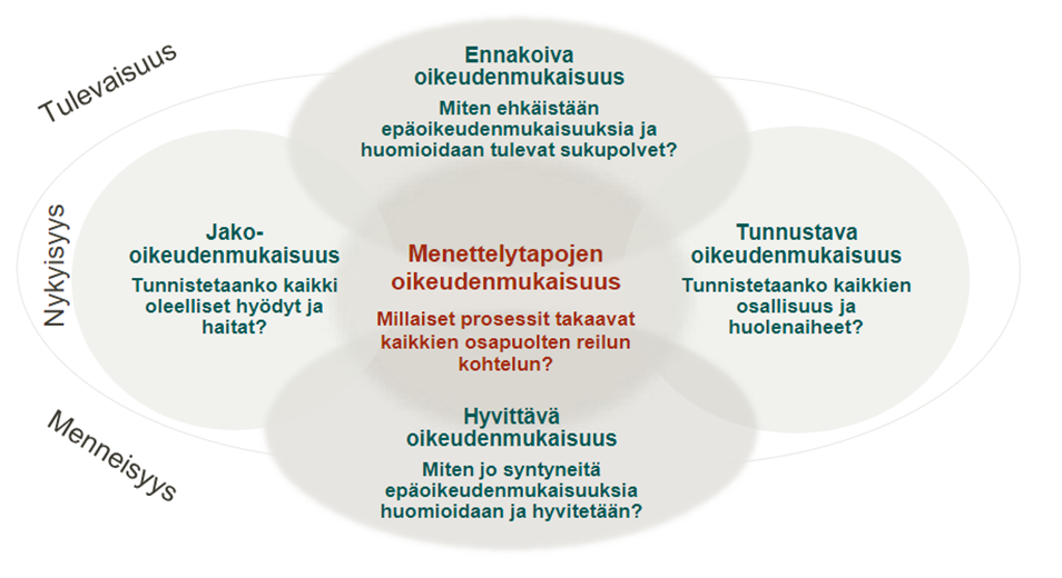 Hankkeen tuloksena tuotettiin myös Kuvassa 1 esitetty jäsennys oikeudenmukaisuuden osa-alueista sekä niiden ajallisesta ulottuvuudesta.