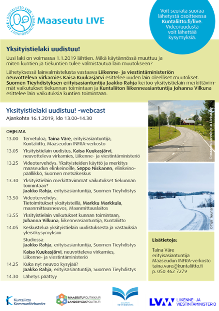 Yksityistielaki uudistuu. Uusi laki on voimassa 1.1.2019 lähtien. Mikä käytännössä muuttuu? Tervetuloa seuraamaan Maaseutu LIVE -keskustelua netin kautta ja esittämään kysymyksiä.